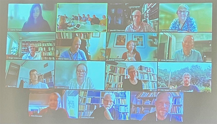 Deltagerne på zoom. 1. rekke fra venstre: Juliane Tiemann (Bergen), møtedeltagerne i Árnagarður, Veturliði Óskarsson (Uppsala), Tone Merete Bruvik (Bergen). 2. rekke: Roger Andersson (Stockholm), Marco Bianchi (Uppsala), Åslaug Ommundsen (Bergen), Jonas Wellendorf (Berkeley, California). 3. rekke: Tarrin Wills (København), Elin Andersson (Stockholm), Anne Mette Hansen (København), Alex Speed Kjeldsen (København). 4. rekke: Nina Stensaker (Bergen), Matthew Driscoll (København), Simon Skovgaard Boeck (København). Fotografiet er tatt av lerretet i rommet – vi beklager fargene!