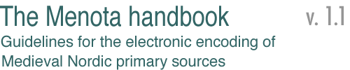 In ISO 6392 there is a list of three-letter abbreviations of language names. In addition to the modern languages dan (Danish), ice/isl (Icelandic), nor (Norwegain) and swe/sve (Swedish), there is only one abbreviation for medieval Nordic, sc. non (Old Norse, i.e. Old Icelandic and/or Old Norwegian). Since Old Norse is a problematic term (and the abbreviation non is idiosyncratic) we recommend the values oda (Old Danish), oic (Old Icelandic), onw (Old Norwegian), osw (Old Swedish). In cases of uncertainty, a slash may be used, e.g. oic/onw for a manuscript which is either Old Icelandic or Old Norwegian (but most probably Old Icelandic), onw/oic the other way round, etc. For Latin we recommend the abbreviation lat (also in ISO 6392). - Except for the attribute value the element may be empty. |