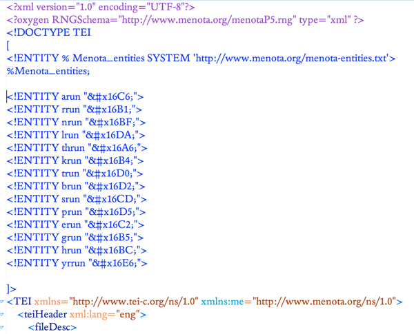 If a character is not listed in the Menota entity list, it can still be encoded using a suitable character entity. Note, however, that a display of such characters require a proprietary font. These entities must be declared at the beginning of the XML file, at the end of the !ENTITY declaration. A list of entities for runic characters with corresponding codepoints in the Unicode Standard may look like this: