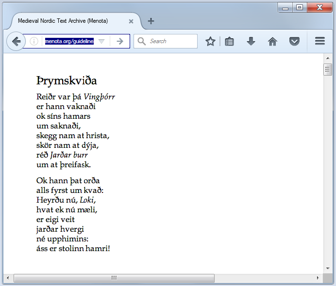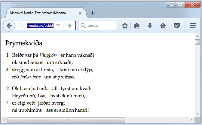 name {font-style: italic}Displayed by an XML-aware browser, such as Firefox (Windows, Mac, Linux), Google Chrome (Windows, Mac, Linux), Safari (Mac), the two first stanzas of Þrymskviða will be displayed as in Fig. 2.1.