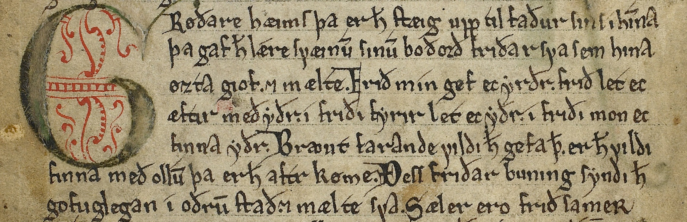 Diacritics – accent marks, dots and hooks – frequently have phonological value, but not always. They are often used to denote quantity (marking long vowels or consonants) or quality (different vowel qualities, such as ǫ vs. o). Sometimes they are, however, without phonological value, as, for example, when vowels that almost certainly were short are rendered with a superscript acute accent. Rather than attempting to differentiate accurately between diacritics with phonological value and those that are superfluous, it seems more practical to simply reproduce all diacritics in the diplomatic transcription (exactly as in the facsimile transcription). As an exception to this rule and in compliance with a long tradition in Norse editorial scholarship, the undotted “i” (that is, “ı”) is rendered with a dot in a diplomatic transcription, even if it is without a dot in the manuscript and the facsimile transcription. The contrast between “ı” and “í” in the manuscript (and the facsimile transcription) is thus replaced by the contrast “i” vs. “í” in the diplomatic edition. Similarly, “y” is usually rendered without the superscript dot (“ẏ”), as the principal function of the dot appears to have been to distinguish “y” from the Insular “ꝩ” (the two are otherwise practically identical in many hands).