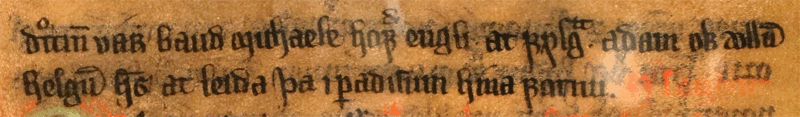 | 1 ꝺ ͦꞇꞇın̄ vá bauꝺ mıchaele hoꝼᷘ englı. aꞇ ꝼylgᷓ aꝺam ok ꜵllū 2 helgū ħs at leıꝺa þa ı ꝑaꝺıſum hína ꝼornu. |